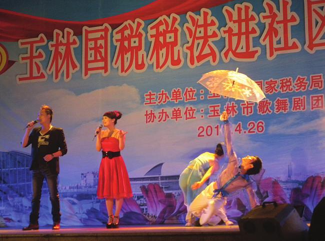 歌声唱起来,舞蹈跳起来。4月26日晚的市青年广场美轮美奂,由玉林市国税局举办的“税法进社区”文艺晚会在这里激情上演。晚会通过独唱、舞蹈、小品、萨克斯演奏等丰富多彩的艺术形式,形象地展示了市国税系统干部、职工的文化风采。舞蹈《春满园》、女声独唱《最炫民族风》、歌舞《唱山歌迎宾客》、小品《相亲》、萨克斯独奏《你的眼神》、歌舞组合《向往和谐》等等,精彩的节目赢得了观众的阵阵掌声。 (本报记者曾昶通讯员谢静摄)