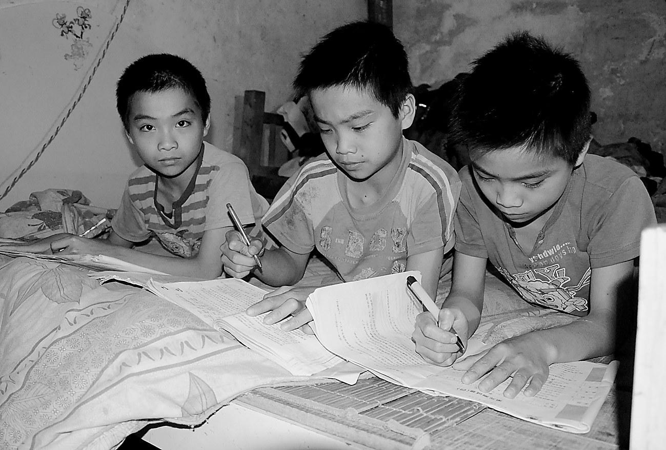 | ▲3个孩子趴在床上一起写作业。 |