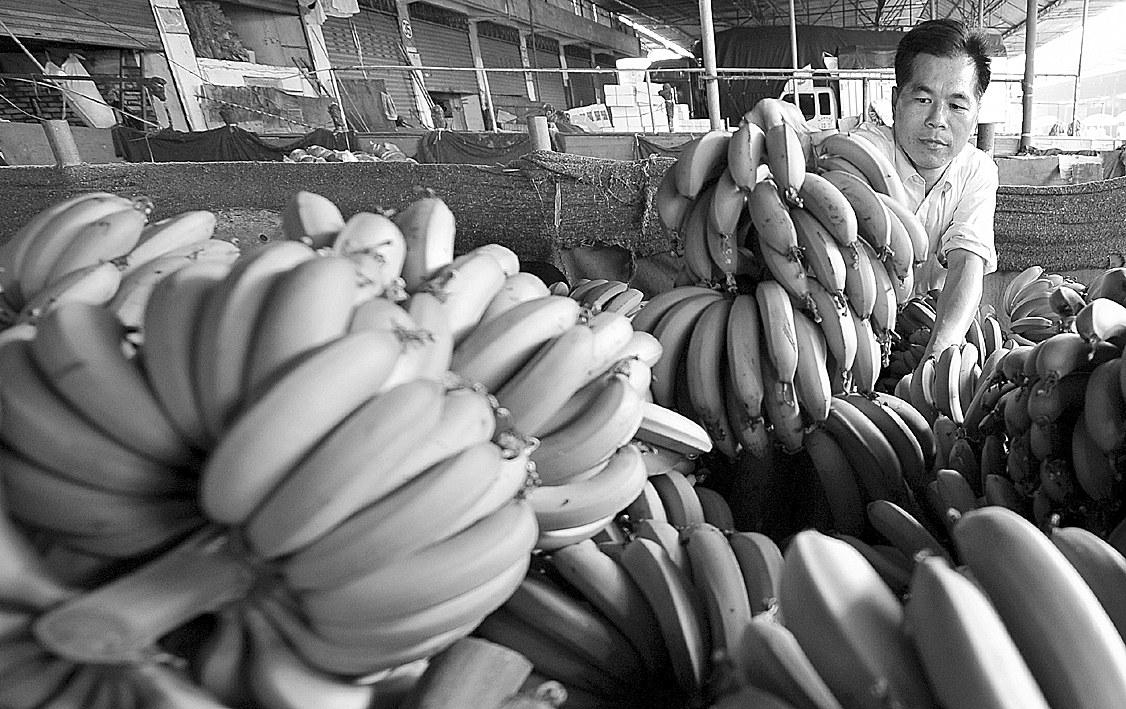 | ▼4月26日,海口市南北水果批发市场的商户正在搬运香蕉。(新华社记者郭程摄) |