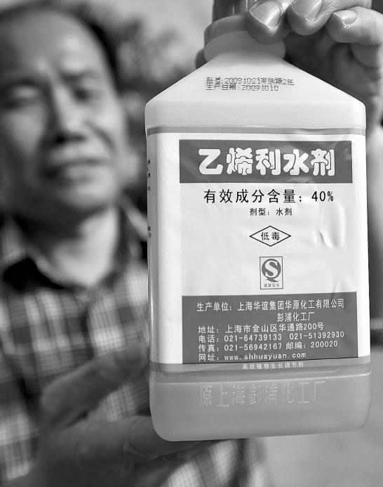 | 4月27日,国家香蕉产业技术体系首席科学家、海南省香蕉协会秘书长张锡炎展示催熟香蕉所用的乙烯利水剂。 |