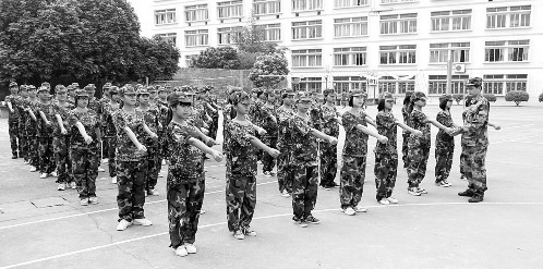 2011年秋季期开学前夕,陆川县人武部组织优秀教练员对陆川县中学、县初中、县二中等10多所学校6000多名入学新生进行军事训练,培养学生吃苦耐劳精神,增强他们的体质和国防观念。图为教练员在对陆川县中学新生进行队列队形训练。