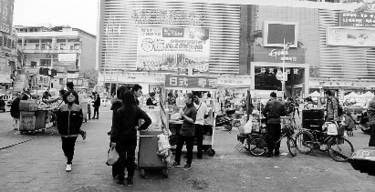 | 南城百货通往国际购物中心的路口人行道被小商贩几乎占领。 |