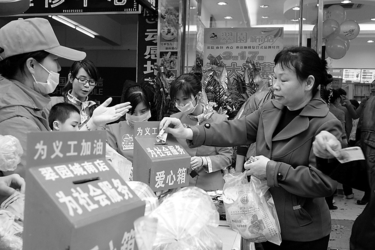 3月19日,北流市义工协会联合翠园饼业等爱心企业开展的义卖活动结束。义卖活动从3月17日开始,3天来共筹集资金6310.7元全部用来资助贫困失学儿童。 (李国伟摄)
