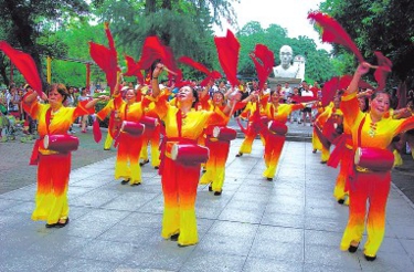 7月1日,玉林市人民公园朱锡昂烈士雕像前热闹非凡,由宇航人集团娱乐养老俱乐部牵头,玉林制药厂老年艺术团、江南艺术团和玉林市老年大学艺术团组成的百名退休党员合唱歌颂党的恩情活动在这里盛情演出。图为歌舞《好日子》精彩上演。(本报记者邱临通讯员曾宜摄)