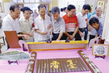 7月1日,玉林市松风书苑在玉林市图书馆举办庆“七一”书法展览,共展出书法作品130幅。这些作品是由17位爱好书法的退休老人创作的。他们年龄最大的84岁,最年轻的61岁。展出的作品篆、隶、楷、行、草和竹刻、石画俱全,内容丰富多彩,体现了老人们老有所学、老有所乐的精神,令参观者目不暇接。图为市民在参观竹刻作品。