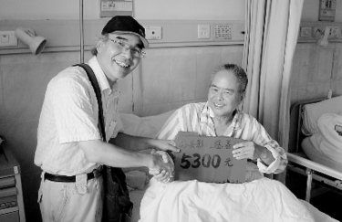 本报容县讯6月28日,笔者接到一位热心网友电话报料:日前,容县摄影发烧友陈国龙代表35名影友前往首府南宁,给患病住院的陆宇老师傅送去爱心捐款5300元。又一个“感恩社会、扶助他人”的道德故事在侨乡容县温馨上演。 据参与捐助活动的一位网友介绍,今年65岁的陆宇是容县摄影界的老前辈,前不久因患直肠癌到南宁某医院治疗。热心肠的陈国龙第一次到南宁探病期间为陆宇献血300㏄,随后在侨乡摄影爱好者经常登录交流的网站——“容县公社论坛”上发帖,呼吁大家奉献爱心支持陆宇战胜病魔。容县众多热爱摄影的朋友为这则“脸在笑、心在哭”的网帖所感动,大家发扬“一方有难、八方支援”的友爱精神,认识的不认识的,少则50元多则500元,大家纷纷伸出援手,短短6天时间就为陆宇捐款5300元。目前,手术得以顺利完成的陆宇正在南宁某医院接受化疗,而容县影友、网友为陆宇捐款的行动仍在继续进行,一些网友通过电话、网络真诚祝福陆宇早日康复,重新拿起相机聚焦美好生活。 左图为陈国龙代表影友把首期捐款送到病榻上的陆宇手上。(封晓天黎文伟摄)