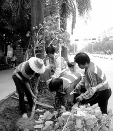 | 图为施工人员在种树。 |