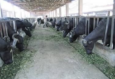 图为饲养员正在给奶水牛喂玉米秆料。(罗德平摄)