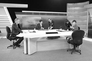 12月16日,在韩国首尔,韩国民主统合党总统候选人文在寅(左一)和新国家党总统候选人朴槿惠(右一)亮相最后一次电视辩论,他们围绕社会、教育、科学、文化以及女性等领域展开辩论。韩国第18届总统选举将于12月19日进行。 (新华社发朴真熙摄)