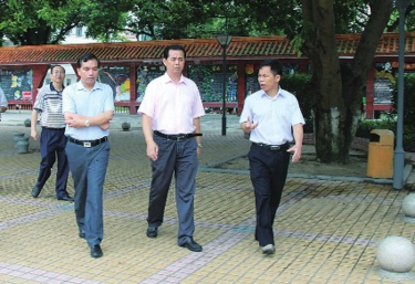 陆川县委书记黄少明(中)在陆川县中学校长邹锋(右一)的陪同下深入陆川县中学调研。