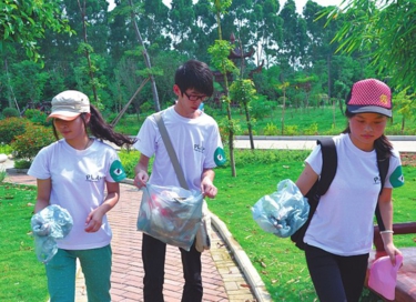 | 图为同学们在北流会仙河公园捡拾垃圾,清洁环境。 (朱秋摄影报道) |