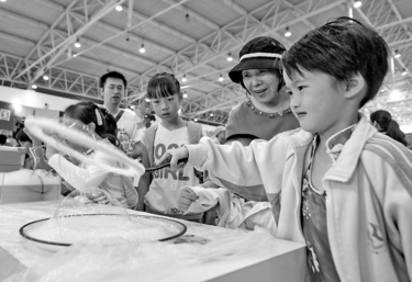 5月19日,小朋友在“美国互动科学套餐”展区体验微型科学实验。