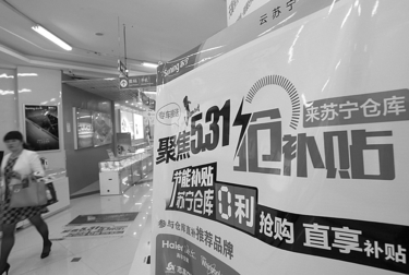 | 5月29日,顾客从江苏南通一电器销售门店的"节能补贴倒计时"提示牌旁走过。财政部、发展改革委、工业和信息化部日前联合下发通知,明确从2013年6月1日起,消费者购买空调、平板电视、电冰箱、洗衣机、热水器5类高效节能家电产品不再享受中央财政补贴政策。财政部有关负责人称,政策实施以来,推广成效显著,节能家电市场份额大幅提升,拉动消费效果明显,政策预期目标已基本达到。(新华社发龙巍摄) |