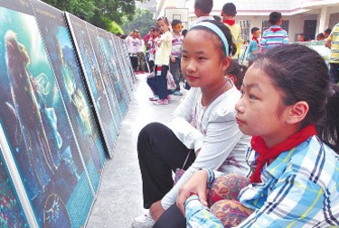 10月31日,由容县科协举办的2013年科普知识入校园活动,首站在容县容州镇中心校举行,内容有中国科技发展成就展、低碳生活展、健康保健知识展、三维透视图等。这次科普知识进校园活动,为该校师生上了一堂生动的科普知识课,让学生们开阔了视眼,增长了知识。图为学生们聚精会神地观看科普知识图片。