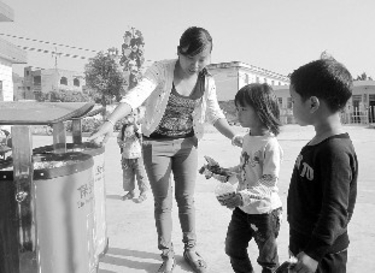 图为蟠龙小学学前班的小朋友在老师的指导下,把垃圾按照可回收和不可回收进行分类投放。(陈小健摄)