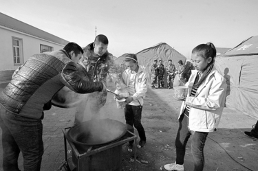 11月1日,在吉林省松原市乾安县,受灾群众在安置点吃早饭。