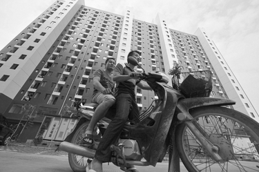 在广西—东盟经济技术开发区上平路,居住在公共租赁住房小区内的两名外来务工青年骑车外出(10月31日摄)。