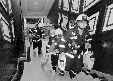 | 演练中,消防官兵深入"火场"搜救被困人员。 |
