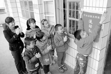 | 图为小班长把流动红旗挂在教室门口。(韦捷摄影报道) |