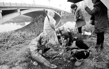 | 图为小朋友们在家长的带领下,冒雨在南流江畔的空地上栽种桂花树。