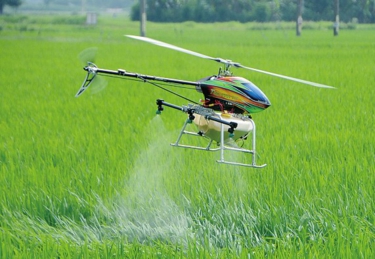 | 农用无人直升机在稻田上方喷洒作业。 |