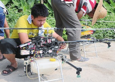 | 技术人员在调试农用无人直升机。 |