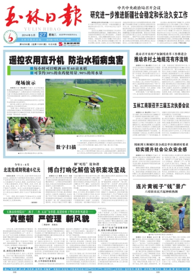 现场演示 本报讯(记者蒋金泰)5月26日,在玉州区城北街道高山村的田间地头,两架农用无人直升机在工作人员的娴熟遥控下,在数米高的空中来回穿梭,时而匀速飞行喷洒出细雾状的农药,时而在空中悬停,轻巧自如地变换高度、速度和方向,让围观的农民惊叹不已。 当天,我市水稻病虫害统防统治农用无人直升机作业现场演示在这里举行。 据介绍,这架无人直升机长1.5米左右,采用锂聚合物电池,作业高度2至4米。 “别看飞机小,喷洒作业可是‘好手’,它每小时可以喷洒40亩至60亩,农药喷洒细密,可以节约30%的农药使用量和节约90%的用水量,快速有效抑制病虫的传播。”现场负责人如是说。 数字扫描 与传统农业机械相比,无人机防治水稻病虫的工作效率有了一个空前的提升,普通农民用电动喷雾器1小时能给2亩农田喷药,而无人机1小时可以喷洒40~60亩,相当于20~30人的工作量。 据测算,无人直升机在稻田作业上每亩一次人工和农药成本约50元,比人工喷药费用减少20元左右;远距离遥控操作,确保喷洒作业人员安全;各种农药包装用完后统一回收,改善了田间的白色污染。