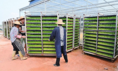 日前,在玉林市水稻工厂化育秧中心,工人们忙碌着把育好的秧苗从育秧大棚搬运到户外“晒太阳”。 玉林市水稻工厂化育秧中心位于福绵区福绵镇上地村,占地面积20亩。2013年,该育秧中心建成了玻璃育秧大棚、工作车间,今年又新上了一条水稻烘干生产线,日烘干量30吨。 据悉,水稻工厂化育秧技术是以精量半精量播种技术为基础,利用机械化生产线播种,采用温室集中培育的一种大规模育秧方式,是一项新兴的农业集约经营、节本增效技术。单位成本比大田育秧降低20%以上,成秧率达95%以上;具有省秧田、省种、省工、省时、育秧周期短、秧苗生长整齐、根粗苗壮、不烂秧,便于机插等特点。(庞飞勇摄)