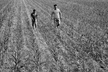 咸阳市武功镇聂村村民崔团峰和一名孩子走在自家的玉米地里(7月30日摄)。