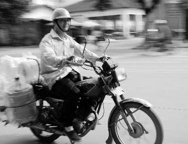 罗师傅今年40多岁,身材不算高大,穿着长袖长裤,黝黑的脸和裸露在外面的脖子被晒得通红,一辆两轮摩托车是他的运输工具,一桶水有20公斤重,一车最多能装8桶水。上午8时,罗师傅将桶装水搬上摩托车装好,开始了一天的忙碌工作。当他把桶装水送到文化广场附近一家公司后,来不及喘口气,直接扛着两桶水直奔5楼,并为客户卸下空桶,装上新桶装水。此时,手机响起,“人民中路×号送1桶水。”“好的。”罗师傅不时接到公司的送水任务,一车水送完后,他就马不停蹄回到公司,拿起毛巾擦了一把脸,在电扇前吹了吹被汗水浸湿的衣服,又接着装水去了。