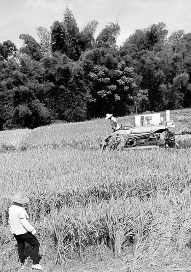近日,湖北、河南等地的收割机专业队30多台联合收割机陆续“涌”进北流市清湾镇,帮助当地群众收割早稻。据了解,该镇交通便利,许多农民为了减轻劳动负担,一般都愿意出钱请收割机收割,收割价格基本和去年差不多,田块面积超过一亩以上每亩价格130元~150元,面积小的每亩150元~180元。该镇1.7万亩早稻预计7月中旬全部完成收割,机械采收率达35.56%。图为农户租请收割机抢收旱稻。 (罗广智摄)