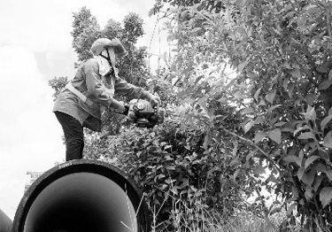 | 园林工人顶着烈日高温修剪绿化树木。(本报记者沈善东摄) |