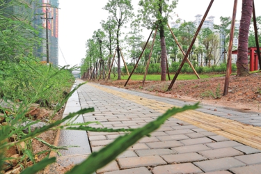 | 7月21日下午,记者冒雨来到正在建设中的江南绿轴看到,铺设了透水砖的外围步道透水性良好,雨水很快下渗,没有在路面形成积水。(本报记者陈东实习生潘攀摄) |