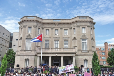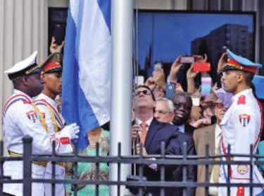 | 7月20日,在美国首都华盛顿的古巴驻美国利益代表处举行的古巴驻美国大使馆开馆仪式上,古巴外交部长布鲁诺·罗德里格斯亲手升起古巴国旗。(新华社记者殷博古摄) |