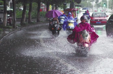 | 玉林城区部分路段出现积水,市民骑车趟水而过。(本报记者沈善东摄) |