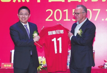 7月23日,恒大集团副总裁刘永灼(左)向拜仁慕尼黑俱乐部主席鲁梅尼格赠送恒大球衣。