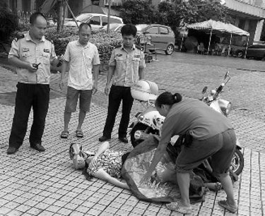 | 热心大妈给摔伤妇女盖上雨衣。 |