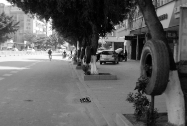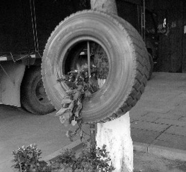 陆川县为美化城区街道,打扮美丽的生态家园,最近有关部门别出心裁,利用旧的汽车轮胎,在轮胎内装泥土种上各种花卉,将其悬挂在县城区温泉路街道两旁的树上,把上千棵街树装饰一新,整齐划一美观,市民称为“轮胎花”。走在街上,满眼的“轮胎花”让人赏心悦目,心情舒畅。图为街树上装饰的“轮胎花”。