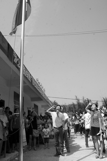 | 升国旗时,志愿者们高唱国歌对着国旗行礼。 |