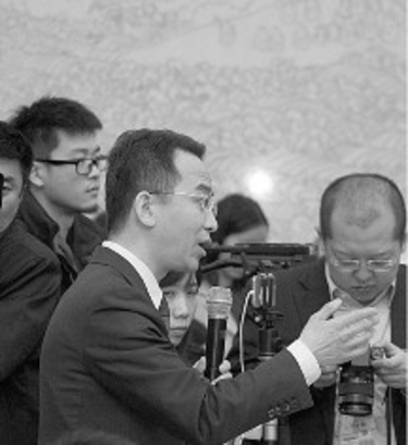 3月6日,在十二届全国人大四次会议黑龙江代表团媒体开放活动上,记者(下图)就“天价鱼”事件向全国人大代表、黑龙江省长陆昊提问。陆昊代表(右上图)表示,“天价鱼”事件并不是偶然的,说明有相当一部分基层干部和企业经营者,在社会监督、舆论监督方面的意识不够;真正理解法律、制度、规则、信用方面的意识不够。事情出来了不是坏事,对黑龙江市场经济的发展来说,是一次进行深刻反省的机会。 (新华社记者吕迅摄)