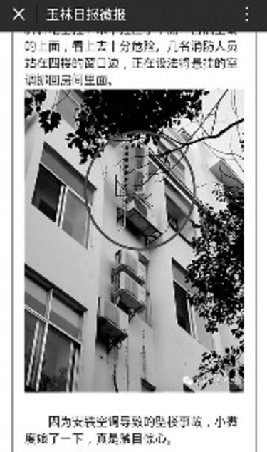 | 玉林日报微报关于公园路空调安装工人坠落的报道。 |