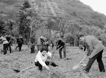 | 3月11日,容县机关干部、驻军官兵、乡镇干部、群众等80多人来到都峤山庆寿岩景区的植树点参加义务植树活动。