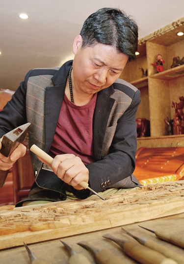 厉子根在创作东阳木雕花板,根据不同的部位使用大小不一的手工木雕刻刀。