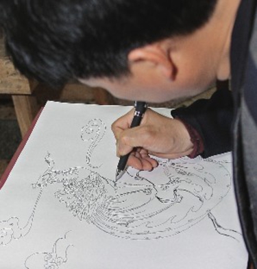 东阳木雕注重创意和"绘画性",厉子根在雕刻前进行图稿设计。