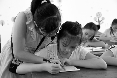 近日,容县图书馆、文化馆的暑期免费少儿文化艺术培训班陆续开班。图为培训班老师用心指导学员如何布局字的间架结构。