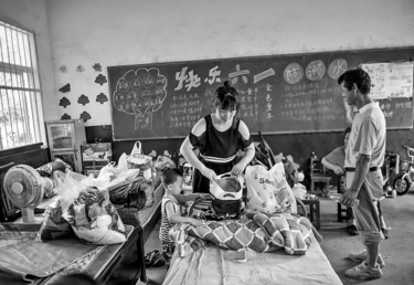 7月14日,离牛山湖最近的大徐村村民喻兰(中)在升华小学安置点整理衣物。(新华社记者 肖艺九 摄) |