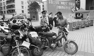 本报讯(记者陈博通讯员梁雁)7月13日,容县公安局召开“神剑2号”专项行动追缴赃物返还大会,展示开展“神剑2号”专项行动取得的工作成效,将缴获的赃物返还给群众。当天,民警在现场共向群众返还被盗抢车辆22辆,其中汽车4辆、摩托车9辆、电动车9辆。群众高高兴兴地领回了被盗抢的车辆。有8名群众还给民警送上锦旗致谢。图为失主领回被盗抢的摩托车。