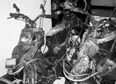 最先着火的车烧得只剩一个架子。 |