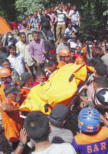 | 12月7日,在印度尼西亚亚齐,救援人员搬运遇难者遗体。