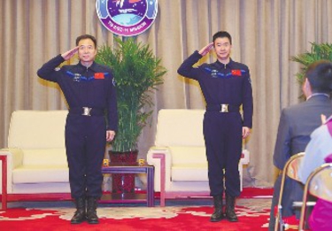| 12月7日,航天员景海鹏(左)、陈冬(右)在北京航天城航天员公寓与媒体见面。(新华社记者 琚振华 摄) |